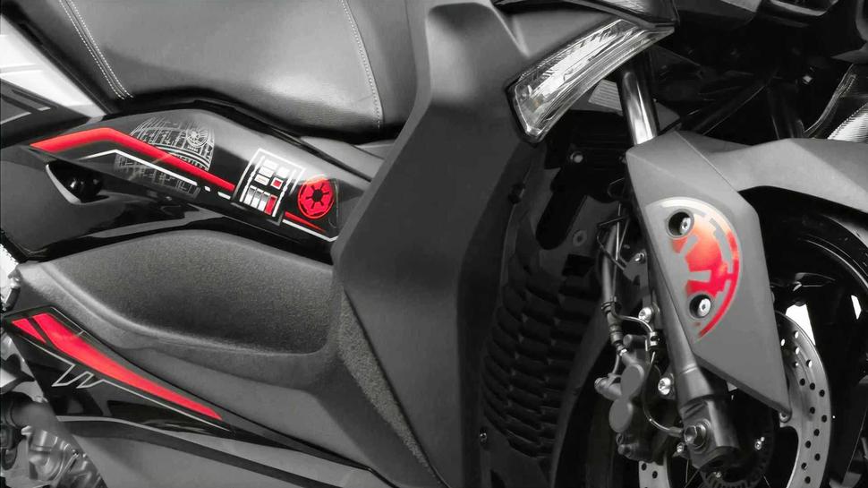 Разумеется, Darth Vader Edition - это про дизайн, а не про характеристики. По крайней мере, межзвёздных переходов новая лимитка вроде бы совершать не умеет, а вот расцветка у Yamaha XMAX Darth Vader Limited Edition, как можно догадаться, глубокая чёрная с металлическими искорками, которую Yamaha называет Midnight Black. Её подчёркивает красная и серебряная графика, создающая весьма зловещую фантастическую атмосферу. Кстати, в прошлом году Yamaha Brazil уже делали что-то подобное в духе мелких кораблей из Star Wars - NMAX в ливреях X-Wing и TIE Fighter.
