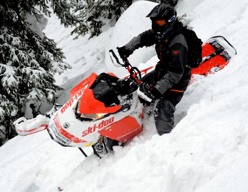 Но не только вышеупомянутые особенности позволяют снегоходу Ski-Doo Summit X Expert избежать пробуксовывания на крутых склонах и глубоких участках снега. Главными врагами горных снегоходов считаются не рыхлый снег и скользкий склон, а неудачная конструкция подножек и хвоста туннеля. И над этими врагами Expert одержал убедительную победу.
