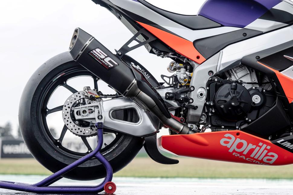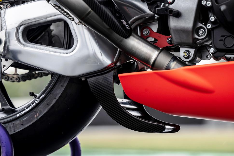 Однако, на этом аэродинамические особенности RSV4 XTrenta не заканчиваются. Присмотритесь повнимательнее - и заметите, что в маятник этого мотоцикла (впервые среди серийных моделей) встроен "закрылок". Фанаты гонок наверняка помнят, что закрылок на маятнике был впервые фактически представлен Ducati в 2019 году, когда, несмотря на недоумение и утверждения, что нижнее крыло обеспечит несправедливое (и, возможно, недопустимое) аэродинамическое преимущество, Ducati на голубом глазу утверждали, что этот элемент используется для перенаправления воздуха на заднюю шину для предотвращения её перегрева. Никто на это объяснение на самом деле не купился, но аэродинамичная форма маятника в том году осталась, и все остальные производители последовали примеру Ducati. По иронии, Ducati и ряд других команд на данный момент отказались от заднего закрылка.