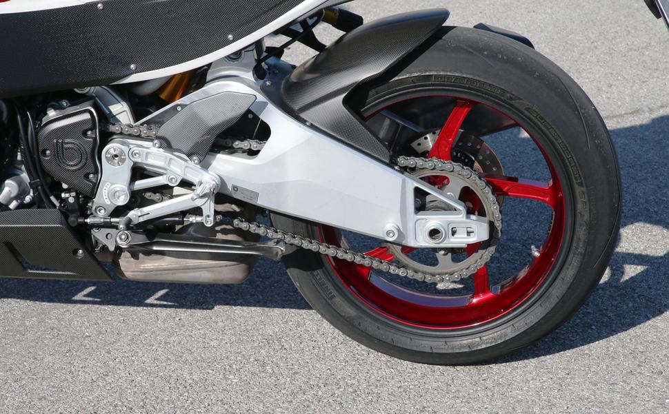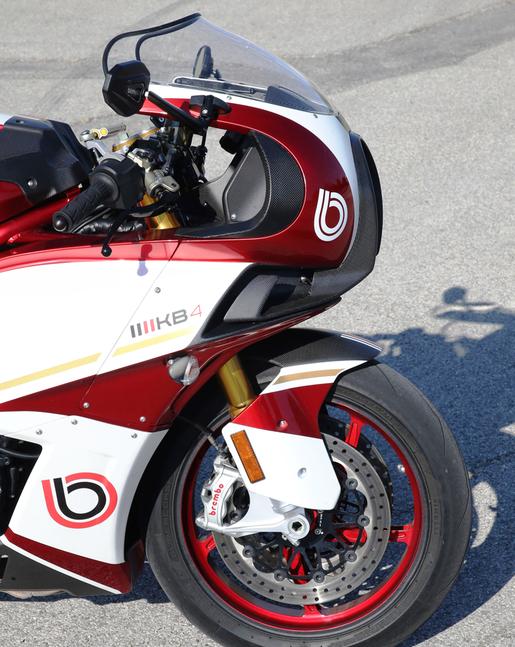 Прежде чем отправиться в горы, чтобы проверить это, Маркони показал один из раздетых мотоциклов на той же основе (KB4 RC Naked), чтобы продемонстрировать, сколь радикальный формат он выбрал. Здесь 16-клапанный четырёхцилиндровый мотор Z1000SX со смещённым цепным приводом на два верхних распредвала расположен значительно ближе к переднему колесу, чем у Ninja, с которой он позаимствован, в результате чего получилась довольно экстремальная развесовка: 54/46% перед/зад, которая просто приклеивает переднюю шину к дороге в поворотах, а собственный вес райдера этому способствует лишь отчасти благодаря довольно вертикальной посадке.