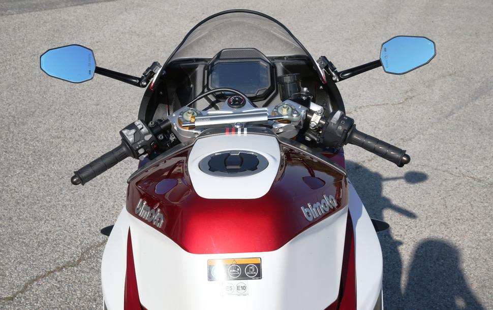 Впрочем, это не значит, что он лишён традиционных для Bimota качеств, таких, как управляемость и производительность. Ему очень по душе нарезать повороты, особенно на хорошем асфальте, и в них отлично чувствуется дополнительное сцепление с дорогой благодаря смещению веса вперёд. Повороты проходятся быстрее, даже если физически не особо помогаешь мотоциклу - это потому, что форма 19,5-литрового бензобака, расположенного за аирбоксом, не позволяет лечь за ветровик, поскольку грудь касается его высокой задней части задолго до того, как наклонишься достаточно далеко.