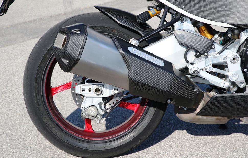 Трёхэлементный алюминиевый маятник, изготовленный из отдельных заготовок из антикоррозийного авиационного сплава, подвешен на полностью регулируемом моноамортизаторе Ohlins TTX36 через рычажную систему. Ход заднего 6-дюймового колеса составляет лишь 122мм. Колёсная база, как уже упоминалось, составляет чрезвычайно малые для для мотоцикла литрового класса 1390 миллиметров. Вся облицовка - карбоновая, благодаря чему сухой вес мотоцикла со всем дорожным оборудованием составляет 189кг. Тормозная система Brembo состоит из двух 320-миллиметровых плавающих дисков спереди (на Tesi H2 они 330-миллиметровые) с радиальными моноблочными четырёхпоршневыми суппортами и одного 220-го диска сзади с двухпоршневым суппортом. Двухканальная ABS от Kawasaki была успешно адаптирована для Bimota, как и на Tesi. Дополнительные регуляторы на задней подвеске позволяют легко подстроить высоту хвоста.
