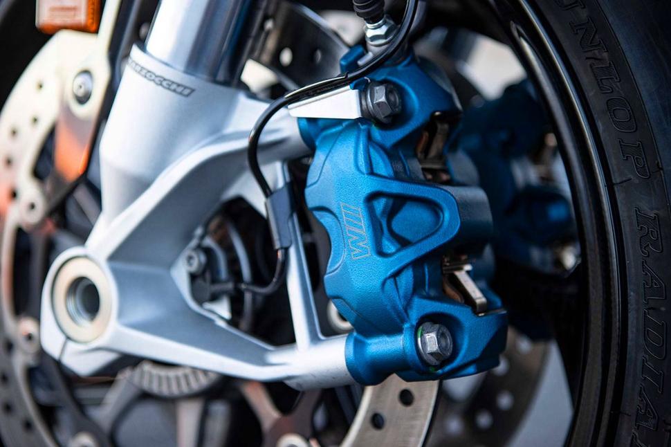 Передняя часть настолько хороша, что тормозные суппорты, брендированные BMW M и разработанные совместно с Nissin, слегка разочаровывают. После довольно агрессивного начального закуса рычаг оказывается не слишком информативен, особенно когда тормозишь в повороте. Само тормозное усилие превосходно, но хотелось бы больше чувствительности и обратной связи. Дополнительно к тормозным контурам можно настроить торможение двигателем, выбрав из трёх ступеней.
