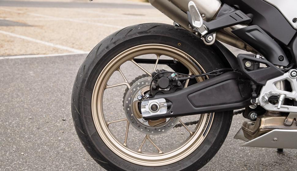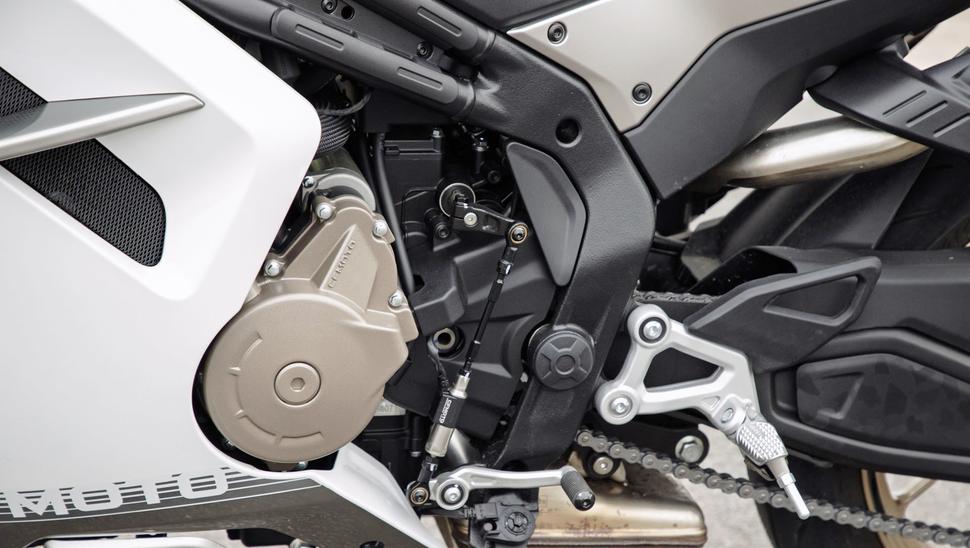 Передаточные числа коробки довольно хорошо подобраны под характеристику двигателя, если не считать того, что первая передача, по сути, не нужна. Трогаться с места получается намного мягче и проще на второй, и похоже, что такая высокая первая была нужна для соответствия каким-то ограничениям по шуму, а не для удобства езды. Но это неважно, просто шестиступая коробка превращается в пятиступую, что только усиливает ощущение ретро-спортбайка.