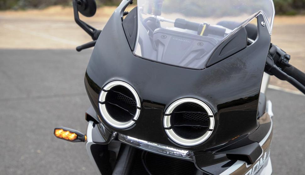 И этот увлекательный малокубатурный рядник очень украшает продуманный дизайн. CFMoto выпускают и серию вполне современных спортбайков типа тройки 675SR-R и рядной четвёрки 750SR-S, но тут они не стали идти проторенной дорожкой, заменив GP-шного вида винглеты на имитацию сдвоенных фар. И сделали это довольно удачно. Выглядят они прямо-таки очень узнаваемо: в мотоцикле спереди видится Suzuki GSX-R750 1985 года. Хотя по факту это инерционные воздухозаборники двигателя, окаймлённые диодными ходовыми огнями. Сообщается, что их конструкция позволила добавить 4лс на пике, когда набегающий поток проталкивается сквозь них и через видимые на внутренней стороне обтекателя патрубки в аирбокс. Настоящие фары VOOM спрятаны ниже под обтекателем.