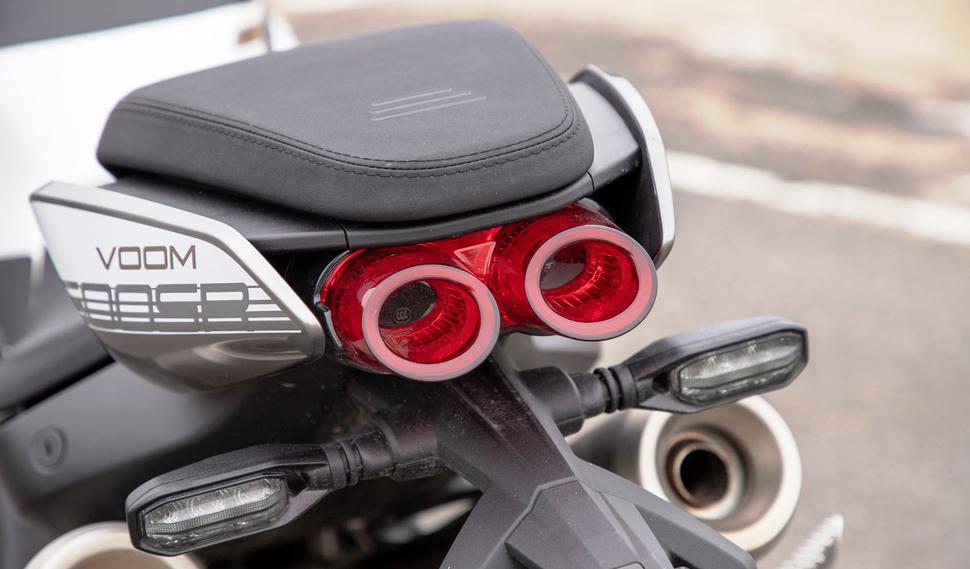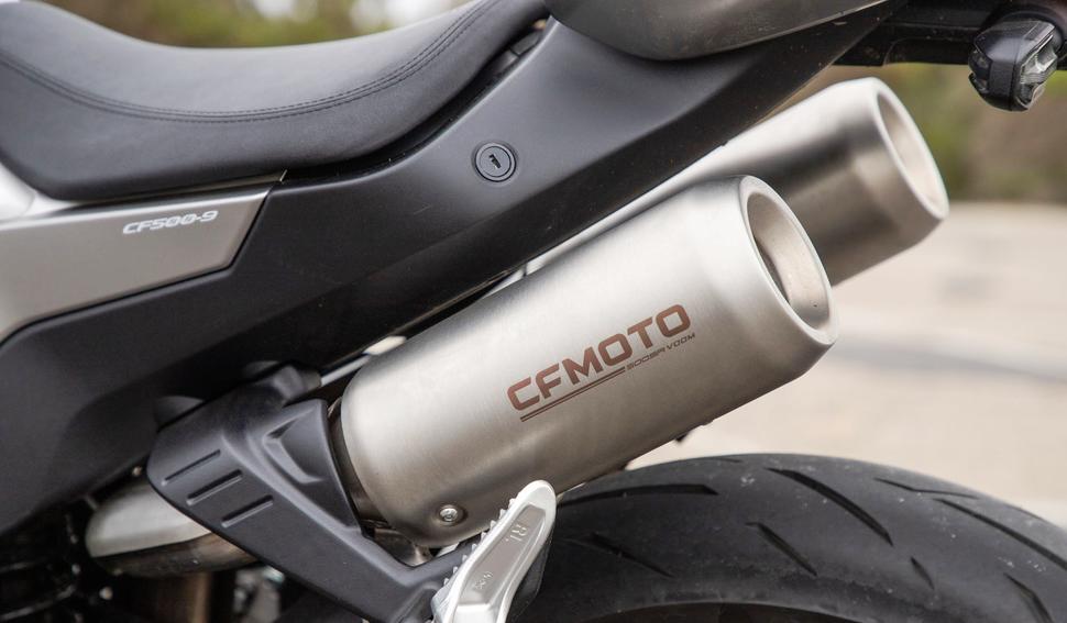 Дизайн продолжается сзади в виде двух круглых задних фонарей и дублируется в сдвоенном выхлопе. Если и этого недостаточно для признания Cfmoto 500sr voom ретро-спортбайком, то в основании плоского бака с завода имеются противоскользящие наклейки.