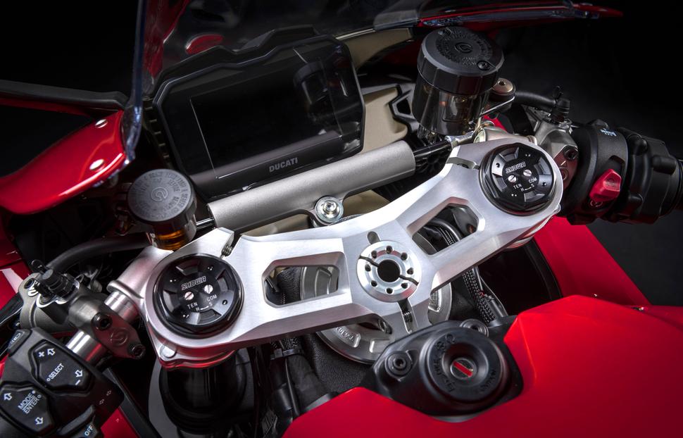 Задние подвески на обоих вариантах остались прежними: на V4 - моноамортизатор Sachs с полным набором регулировок, а на V4 S - Ohlins TTX36 с электронной системой управления Smart EC 2.0. Для уменьшения просадки зада на ускорениях, Ducati подняли расположение оси маятника на 4мм.