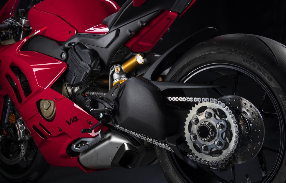 1103-кубовый 90-градусный V4 Desmosedici Stradale получил новый маслонасос и систему смазки. Выходы глушителя были увеличены в диаметре для повышения пропускной способности и производительности двигателя. Для рынков с действующими нормами Euro 5 эти изменения привели к увеличению выходной мощности до 215,5лс на 13000об/мин (на 1,5лс относительно версии 2021 года), пиковый крутящий момент при этом остался на прежнем уровне - 124Нм. Американская версия, как всегда, чуть слабее - она выдаёт 210 сил на 12500об/мин и 123,7Нм на 9500об/мин.