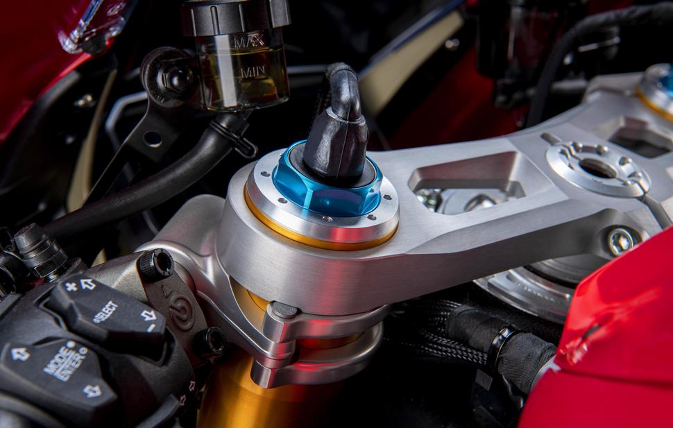 Передняя подвеска Ducati Panigale V4 с 2021 года не изменилась: это 43-я вилка Showa BPF с полным набором регулировок, а вот на V4 S прежняя вилка NIX30 была заменена на Ohlins NPX25/30 с электронным управлением. Разработанная на основе гоночных вилок Ohlins, NPX 25/30 оснащена новой системой сглаживания на основе картриджа высокого давления, который, по данным Ducati, улучшает поддержку на торможениях, улучшенное поглощение неровностей и чёткость обратной связи.