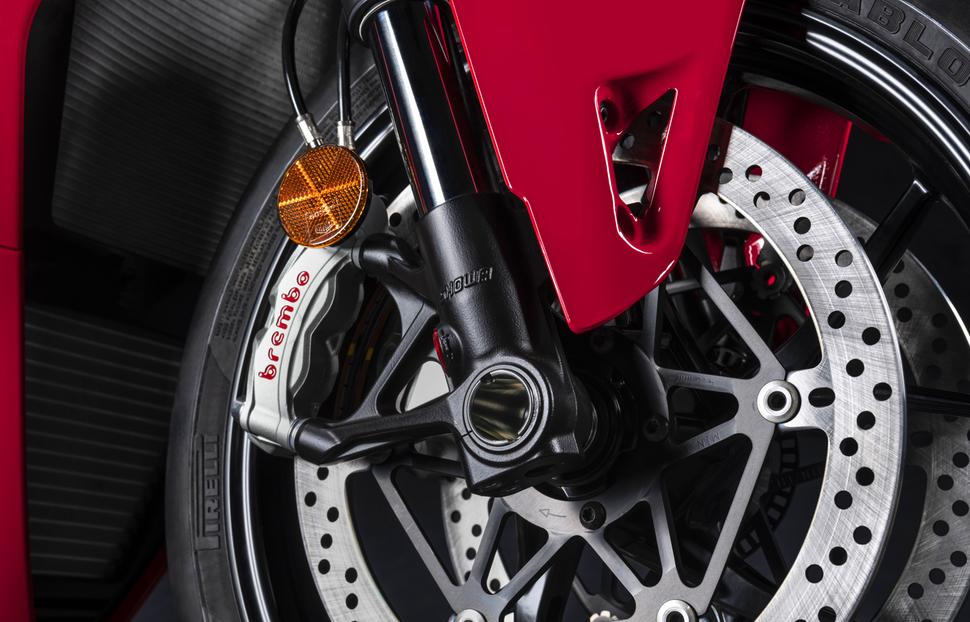 Тормозная система с 2021 года не поменялась: оба варианта V4 оснащены двумя радиальными моноблочными четырёхпоршневыми суппортами Brembo Stylema M4.30 спереди и одним двухпоршневым суппортом сзади. В обе комплектации входит наклонная ABS Bosch EVO. Кроме того, оба V4 оснащены трекшн-контролем, вилли-контролем, слайд-контролем, системой управления торможением двигателем, лаунч-контролем и квикшифтером.