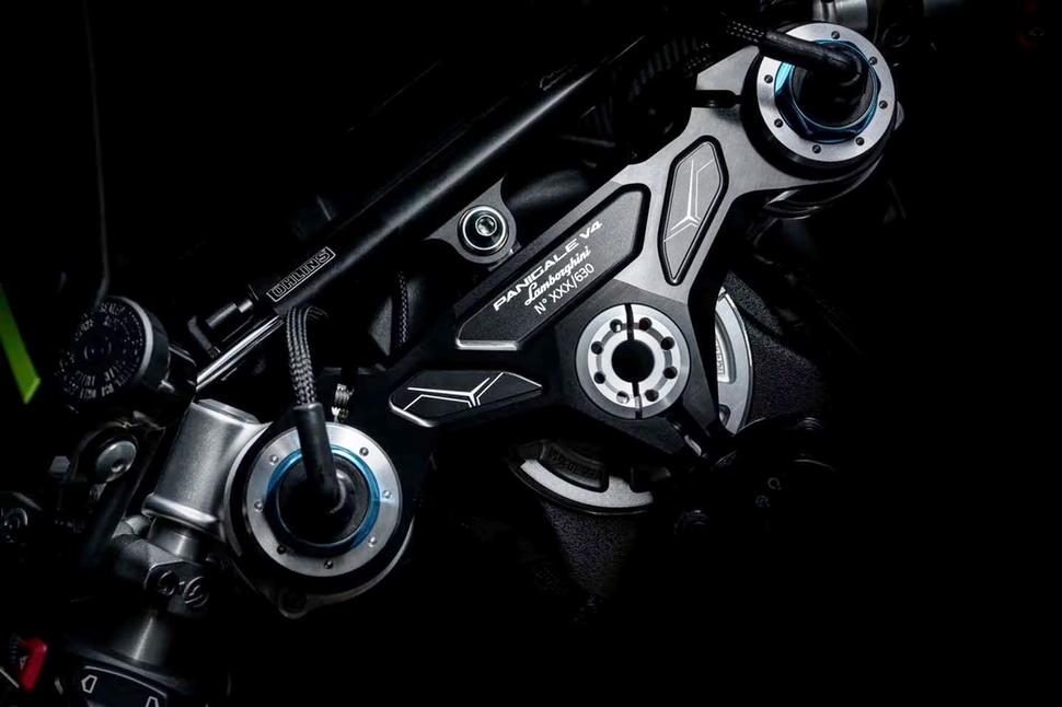Особенности шасси, делающие Panigale V4 S одним из самых продвинутых и производительных супербайков в своём классе, унаследовал и вариант V4 Lamborghini. Среди них - вилка Ohlins NPX-30 с подпором и амортизатор Ohlins TTX-36, обе подвески оснащены электронными регулировками Smart EC 3.0. Траверсы вилки изготовлены на фрезере из цельной алюминиевой заготовки, при этом на каждом экземпляре выгравировано название модели и серийный номер экземпляра. Рычаги сцепления и тормоза, подножки и табличка двигателя тоже заявляют, что этот двигатель Desmosedici Stradale выфрезерован из алюминиевой заготовки.
