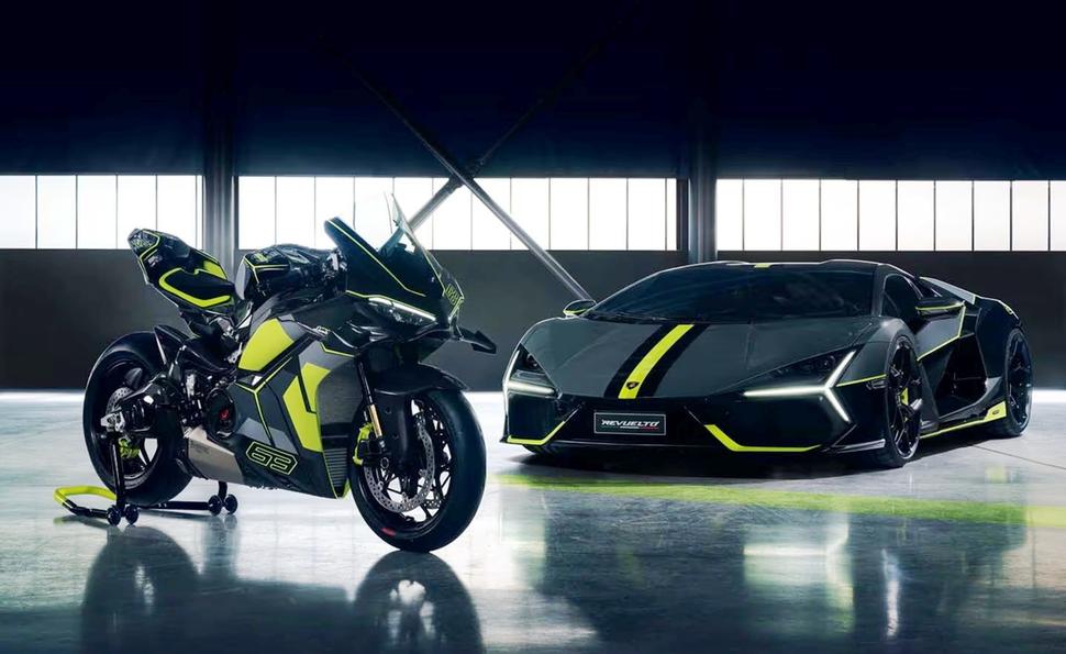 А теперь пришло время создать спец-Lambo-версию крутейшего супербайка Ducati, а именно Panigale V4 S, представленного в июле 2024 года. V4 S уже породил две эксклюзивные лимитированные версии, Tricolore и Tricolore Italia, а его новый вариант ассоциирован с новейшим творением Lamborghini. Речь идёт о Revuelto, великолепном суперкаре с новым 6,5-литровым V12 мощностью 825лс и тремя электродвигателями суммарной мощностью в 190лс - итого 1015лс, доставляемые через восьмиступенчатую коробку передач на все четыре колеса. Lamborghini Revuelto разгоняется до сотни за 2,5 секунды, максимальная скорость достигает более 350км/ч, и всё это с подобающей аэродинамикой и ходовой частью, позволяющими в полной мере насладиться этим потенциалом.