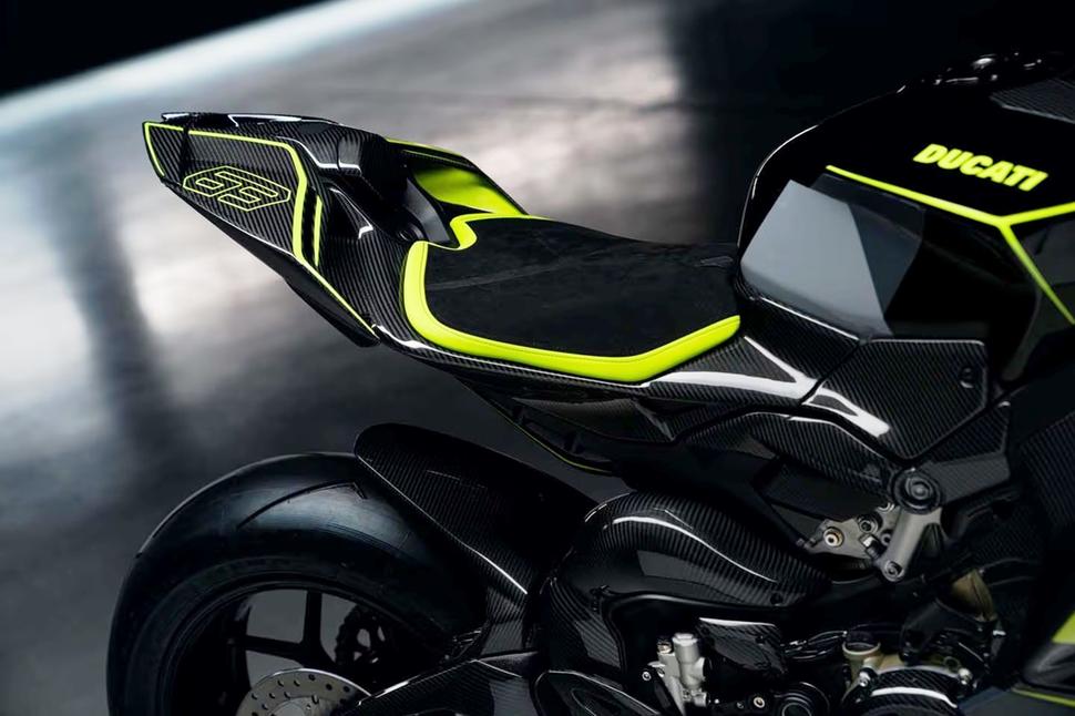 Ducati Panigale V4 Lamborghini выйдет ограниченным тиражом в 630 единиц и будет самым лёгким и богато оснащённым Panigale V4 S. Его эксклюзивность начинается с кованых алюминиевых колёс с дизайном, перекликающимся с Revuelto. Также суперкар вдохновил дизайн одноместного хвоста и аэродинамических крыльев спереди. Крылья выполнены из карбонового композита с открытым плетением. Да и большинство элементов обвеса Panigale V4 Lamborghini сделаны из карбона, включая полный обтекатель, передний и задний колёсные крылья, защиту цепи, защиту пяток, кожухи вилки, щиток глушителя, крышку генератора, кронштейн номерного знака, крышку передней звезды, обтекатель бака, кронштейн приборной панели и кожухи охлаждения передних суппортов.