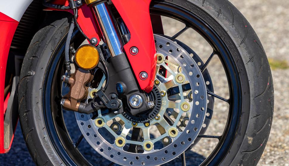 Седло, конечно, тонкое, но оно приятной формы, а бёдра находятся под торсом, давая дополнительную поддержку. Форма бака и тщательно продуманная аэродинамика работают вместе, обеспечивая довольно комфортную езду. По сырой погоде недостаёт современного трекшн-контроля, а вот по сухому асфальту как-то особо не переживаешь - это всё-таки не литр с монструозной тягой, способной провернуть под тобой всю планету. Довольно традиционны для Honda и комбинированные тормоза с ABS на обоих контурах.