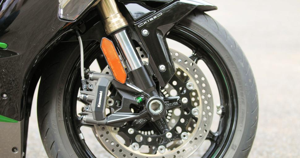 Подвески, судя по всему, проектировались из соображений комфорта. Штатные настройки перевёрнутой вилки Kawasaki Ninja H2 SX отлично подходят для трассы, но на серпантинах хочется затянуть её. Всё-таки вес очень влияет на такие вещи, как клевки при торможении и складывание вилки, когда переднее колесо возвращается на дорогу из вилли.