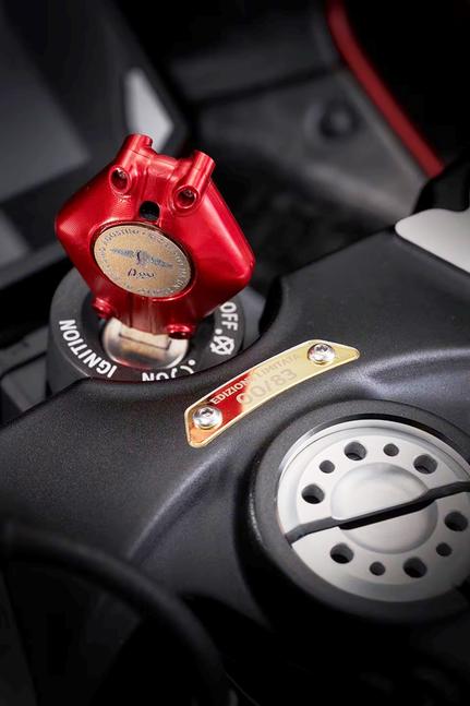 Каждый экземпляр Superveloce 1000 Ago лично подписан Джакомо Агостини и снабжён сертификатом подлинности. Ещё один эксклюзивный штрих - это ключ зажигания. В его конструкцию входя два кольца, изготовленных из высокопрочного алюминия, а затем анодированных в ярко-красный цвет. С одной стороны ключа встроена латунная монета, сделанная из крыла одного из призов Джакомо Агостини, который он выиграл в своей первой гонке GP 500cc в Имоле. Джакомо сам выбрал приз, который он посчитал подходящим для этой цели, и позволил MV Agusta взять крыло и напечатать монеты.