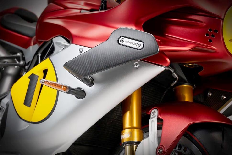 Исторические отсылки и современные технические решения сочетаются в элегантных спицованных колёсах с алюминиевыми ободами, окрашенными в серо-серебряный цвет. Уникальным нюансом является золотого цвета шильдик, вставленный в кожаный ремень на бензобаке. На нём написано "15 Titoli Mondiali" - 15 мировых титулов. Ещё один шильдик с серийным номером встроен в рулевую колонку, и он имеет покрытие из настоящего золота.