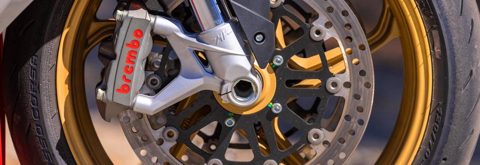 По части подвесок - перевёрнутая 43-я вилка Marzocchi с регулятором отбоя, сжатия и преднатяга, а сзади моноамортизатор Sachs с тем же набором регулировок. Два 320-х диска с радиальными Brembo M4.34 спереди и один 220-й с двухпоршневым Brembo сзади. Звучит чертовски похоже на F3 800, потому что так и есть.