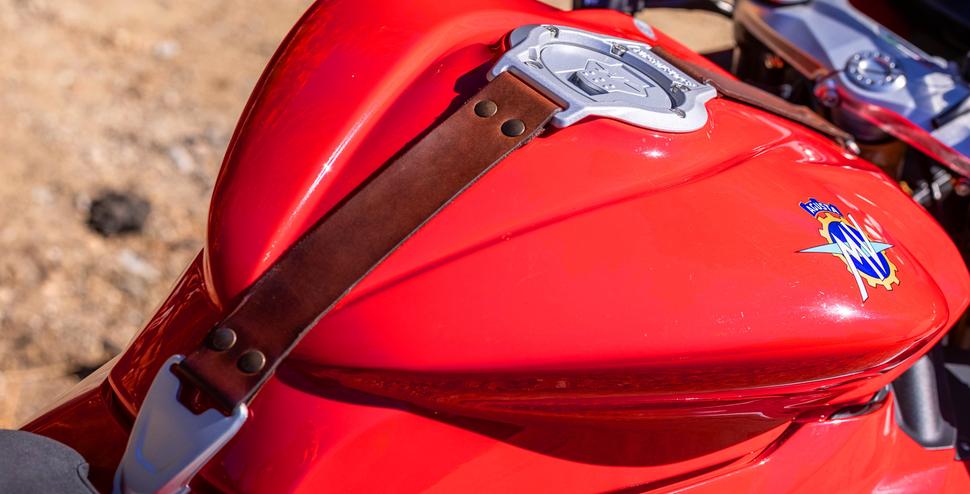Смотрим дальше, и видим складки и наплывы, образующие топливный бак, который выглядит довольно современно (и даже, может быть, излишне вычурно), но кожаный ремень вдоль бака - ещё одна недвусмысленная отсылка к прошлому. Раньше ведь баки действительно крепились кожаными ремнями, но уместна ли такая отсылка на современном мотоцикле, решать вам.