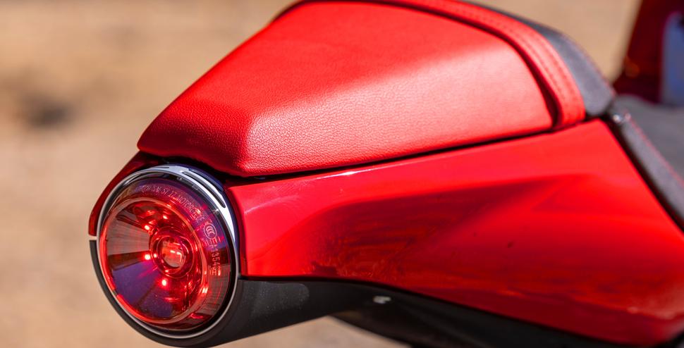 Следом - узкий и изящный хвост мотоцикла. Его пропорции происходят напрямую от гоночных мотоциклов прошлого, он миниатюрен, и при этом великолепно дополняет весь остальной дизайн, связывая его воедино. Маленький диодный задний фонарь, как и фара спереди, прост и незатейлив, но это и подкупает. Лаконичность и изящество ему придаёт и то, что поворотники и держатель номера установлены не на хвосте, а на отдельном выносе, прикреплённом к маятнику, а хвост выглядит летящим в воздухе.