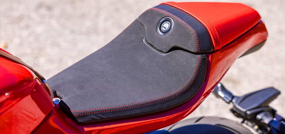 Там же, на треке, вылезли и три косяка MV Agusta Superveloce, по-настоящему неприятных для меня. Во-первых, MV Agusta Superveloce тесный. Да, маленький хвост смотрится здорово, но на практике маленькое, но глубокое одиночное сиденье садит райдера в одну фиксированную позицию и не позволяет ни отодвинуться назад, ни сдвинуться вперёд, ни хорошенько поёрзать, устраиваясь. Даже с моими 170см мне было неуютно и тесно. На треке это не беда, но выезжая куда-то ещё, быстро устанешь от такой посадки.