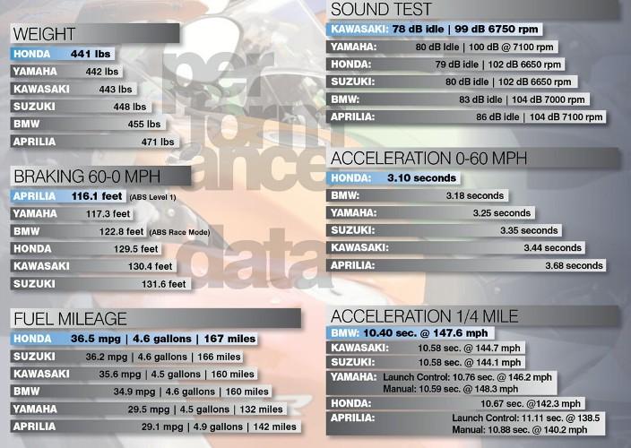 Н смотря на самый маленький показатель максимальной мощности, легковесный CBR разогнался с 0 до 96км/ч быстрее всех, показывая, как он может двигаться от светофора к светофору. На дистанции 402 метра байк составил достойную конкуренцию, отстав от лидера класса BMW всего на три десятых. Хотя силовой агрегат Honda не имеет таких функций, как квикшифтер и автоблип для понижения передачи, он имеет прекрасные эксплуатационные качества. Honda—это простой мотоцикл, включается и выключается кнопкой, и никакого хлама.