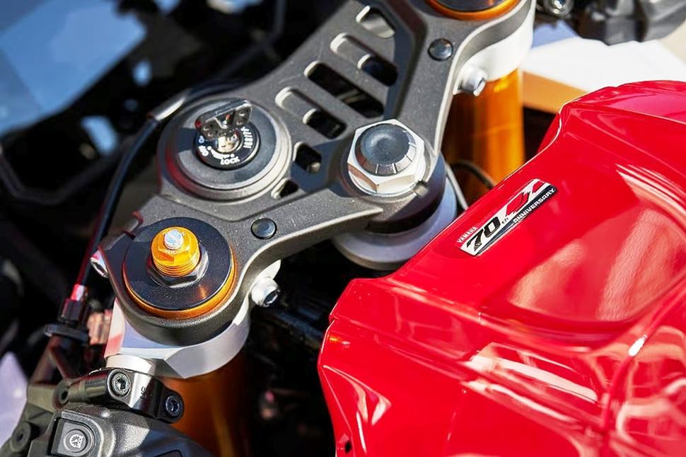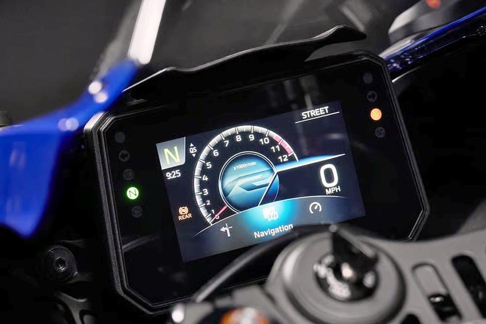 Всей этой электроникой управляют через пятидюймовый TFT-экран, который, позволяю себе смелое заявление, лучший в классе. К его функциональности на дороге мы еще вернемся, но экран одновременно и хорошо виден, и прост в управлении. Режимы езды быстро переключаются кнопкой на правом руле, а сам экран контролируется четырехпозиционной клавишей-качелькой на левом. Кроме того, спарив байк с приложением Yamaha Y-Connect, вы легко загружаете предустановленные трековые режимы. А для тех, кому нужно еще больше приложений на телефоне, приложение Y-TRAC Rev позволяет отправлять на дисплей байка сообщения в реальном времени — например, "заезжай в боксы" или просто "МОЛОДЕЦ".