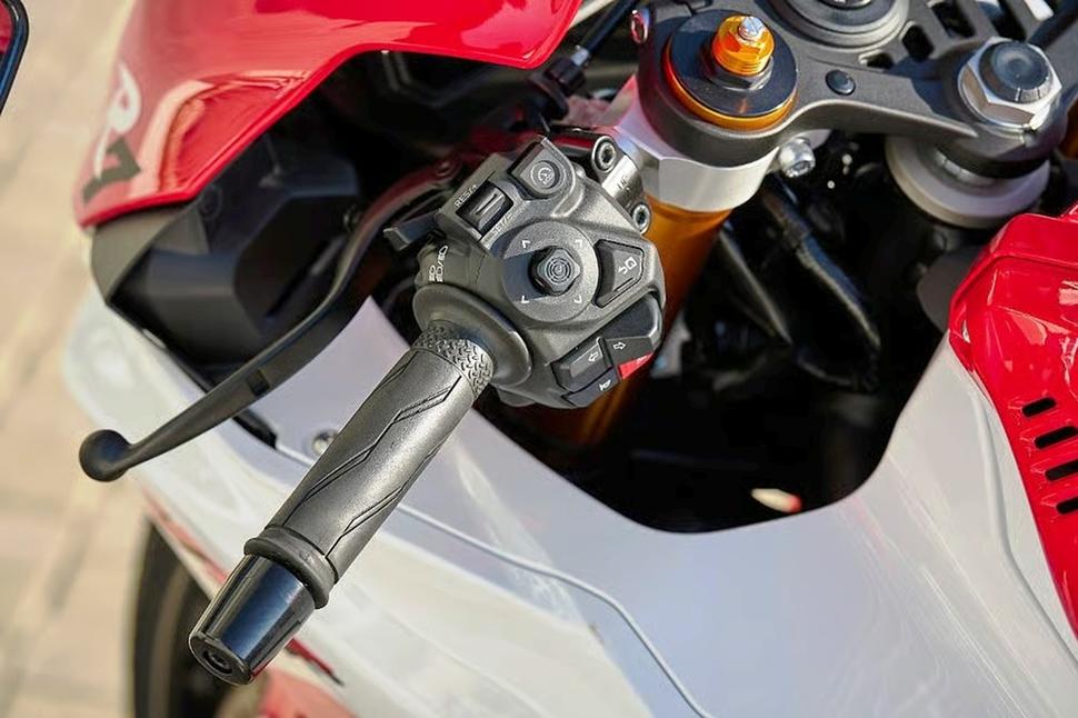 Дизайн Yamaha YZF-R7 2026 года — вот где заметны уступки улице. У нового байка слегка изменилась посадка: ручки подняты и приближены к седлу, а само седло опущено. Комфорт у каждого будет свой, но мне руки оказались слишком близко, когда я наклонялся в агрессивной посадке. Райдеры повсеместно оценят дополнительные 1.1 литра топлива (теперь бак — 14 литров (3.7 галлона)), что почти компенсирует прибавку в весе почти на килограмм (заявленный вес снаряженного байка 2026 года — 189 кг (417 фунтов)). Выезжая со стоянки отеля, я концентрировался на том, куда нажать, чтобы включить поворотник. Отчасти это вина эргономики запястий на спортбайке, но отчасти — дизайна клавиши поворотников. Yamaha одарила R7 автовыключающимися поворотниками, а также сдвоенной функцией: нажмите слабо — три мигания для перестроения, нажмите сильно — непрерывное моргание.