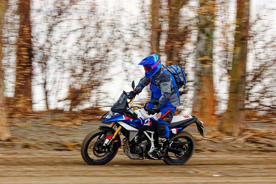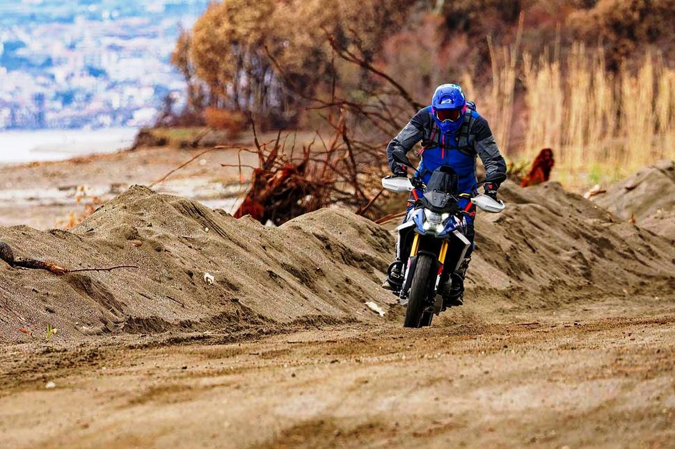 Тесты на бездорожье на Сицилии включали песчаные пляжные дороги и грязные горные тропы с россыпями крупных камней. Когда покрытие становится мягким, 19-дюймовое переднее колесо — даже с агрессивными Karoo 4 и спицованными колесами — либо срывается в снос, либо зарывается в зависимости от подачи газа. На быстрых грунтовках BMW F 450 GS — настоящий праздник: он предсказуемо скользит и веселит. Снаряженная масса 178 кг (392 фунта) ощущается легче, а широкий руль и эндуро-подножки позволяют кидать байк из стороны в сторону без напряга.