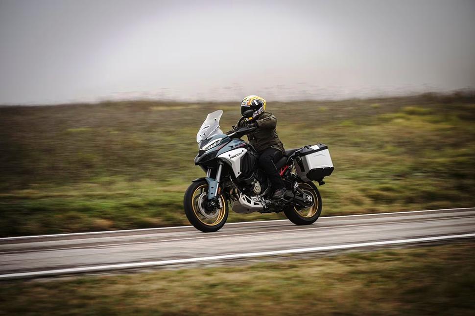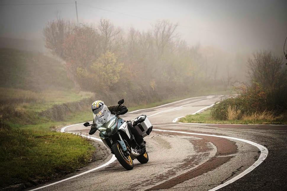 Весьма резвые сотрудники Ducati вывели группу тестеров в извилистые холмы недалеко от завода в Борго-Панигале, но, к сожалению, удовольствие от езды постоянно нарушалось мигающими предупреждениями о льде на дороге на впечатляюще информативной новой 6,5-дюймовой приборке. В Туристическом режиме езды, с комбибрейком (третий режим тормозной системы) и автоматическим режимом подвесок Skyhook мотоцикл даёт комфортный ход и сам заботится почти о всех возможных настройках. Подвески подстраивают не только сглаживание, но и преднатяг пружин исходя из обстановки. И вместо того, чтобы выбирать режим вручную (Динамичный, Комфортный или Скользкая дорога), можно использовать автоматический и позволить системе делать свою работу.