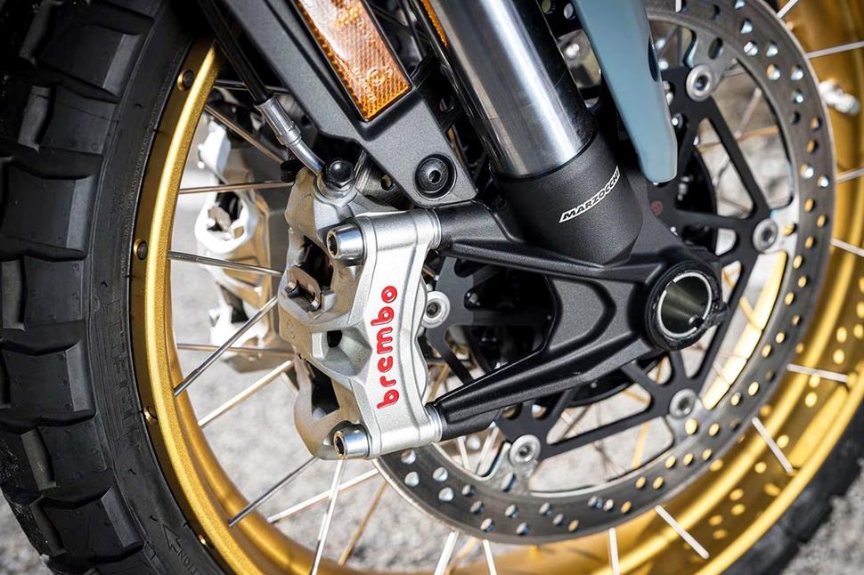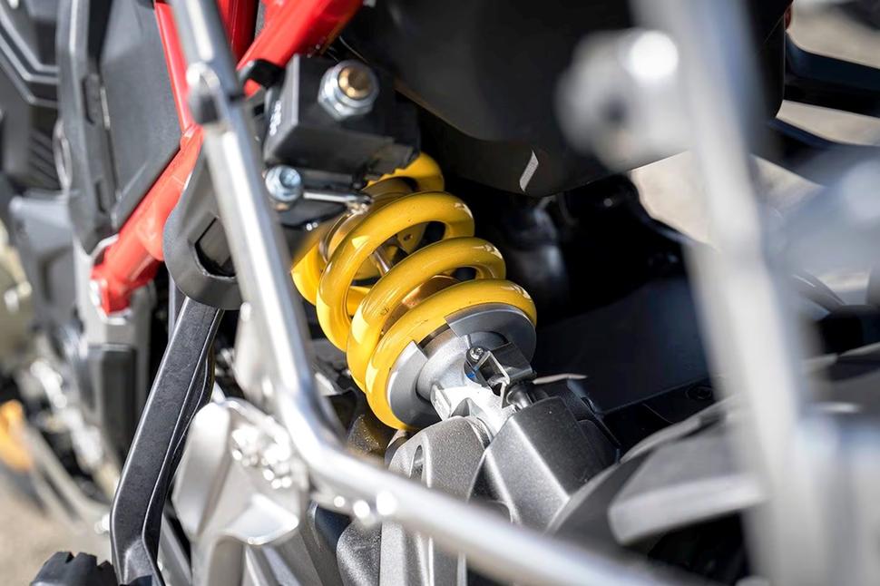 Это отличная новость для тех, кому нравится идея большого адвенчера, но не нравится болтаться в воздухе, не доставая до земли ни одной ногой. Когда скорость Rally падает ниже 10км/ч, преднатяг заднего амортизатора распускается и пружина сжимается под весом райдера, благодаря чему и дорожный просвет уменьшается, а при ускорении он плавно увеличивается обратно до 50км/ч. В общем, вместо того, чтобы в панике искать кочку или бордюр для безопасной остановки, невысокие райдеры смогут управлять Rally в городском потоке, не отвлекаясь. Более того, система имеет несколько настроек для бездорожья и может быть отключена.