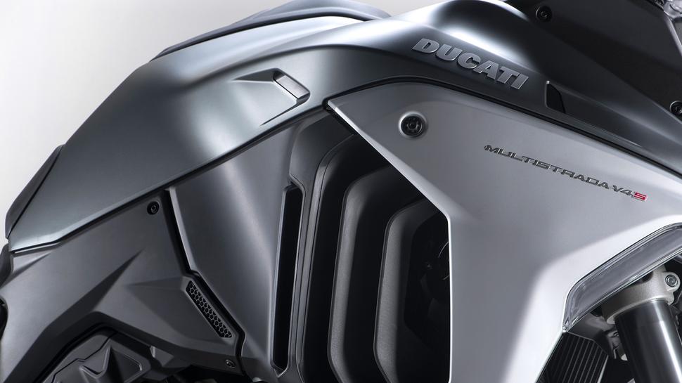 Обновления шасси Ducati Multistrada V4 S 2021 были довольно масштабными, но главной их целью было повышение комфорта: новая форма обоих сидений и проработанный (наконец-то!) вопрос с отведением лишнего тепла от двигателя. Боковые радиаторы обдуваются через жабровидные решётки, а за передним колесом начинается воздуховод, выходящий через небольшое отверстие позади радиатора чуть перед коленом водителя. Он определённо создан с целью обдува райдера и отвода жара двигателя на ходу. Кроме того, под радиаторами видны элементы, похожие на аэродинамические крылья, но созданные для перенаправления свежего воздуха на ноги райдера.