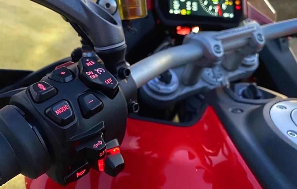 Органы управления, приборная панель и прочая эргономика Multistrada V4 S 2021 очень напоминают прошлую Multistrada - широкий высокий руль, скромный ветровичок, симпатичная приборная панель. Бак и обтекатель довольно массивны, и создаётся впечатление, что основная часть мотоцикла находится перед райдером, а сам райдер сидит в мотоцикле, а не на нём. Традиционно для сегодняшних реалий, цифровая TFT-приборная панель сияет цветными меню и параметрами и управляется преимущественно пятипозиционным джойстиком и несколькими кнопками на левом пульте. Шустрый электростартер будит двигатель, и тот начинает свою неровную, утробную песенку, по которой отчётливо слышен порядок зажигания, напоминающий двухцилиндровые двигатели - так называемый "Twin-pulse", традиционный для нынешних V4 от Ducati.