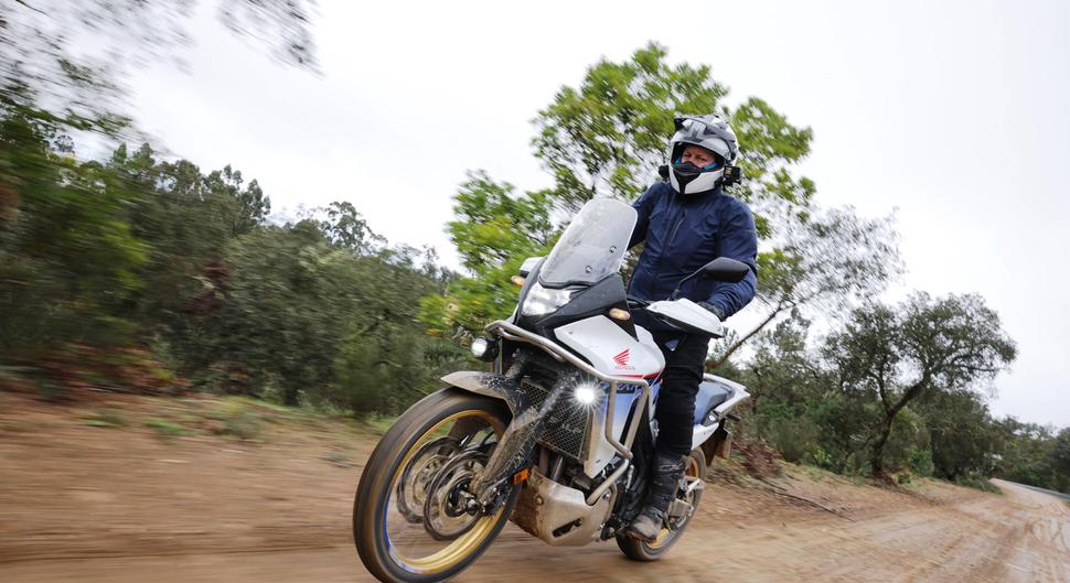 У Honda Transalp имеется пять режимов езды: Спортивный, Стандартный, Дождевой, Гравийный и Пользовательский. Они влияют на отклик на ручку газа (но не на пиковую мощность), уровни вмешательства торможения двигателем, трекшн-контроля и ABS. Но даже в Гравийном режиме с мягким откликом мотоцикл ведёт себя резковато из-за асфальтовых шин, и в целом этот небольшой прохват по бездору мало что раскрыл из его возможностей. Наверное, будь дорога сухой, было бы попроще. Ну а на более внедорожной резине Honda явно стала бы куда более эффективным мотоциклом двойного назначения, если, конечно, выбирать маршруты и ехать аккуратно.