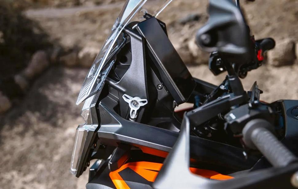 Визуально 1390 Super Adventure S EVO - типичный KTM, но ставший более компактным и мускулистым, чем предшественники. Вся передняя часть переработана: он имеет более узкую фару и обновлённый обвес, сделавший пропорции мотоцикла более стройными и при этом улучшивший аэродинамику. Проектирование с применением аэродинамической трубы принесло свои плоды: легко регулируемое ветровое стекло теперь имеет диапазон регулировки в 7см, давая хорошую ветрозащиту при минимальной турбулентности. Посадка для роста 175см просторная и удобная, со множеством продуманных мелочей. Например, отсек перед крышкой бензобака стал больше, в нём расположен порт USB-C для зарядки смартфона, а ещё один зарядный порт имеется рядом с приборкой. Обновлённые вентиляторы радиатора и облицовка лучше отводят тепло, направляя нагретый воздух от райдера. KTM даже включили в комплект набор инструментов, аккуратно упакованный под седлом - приятный бонус для путешественников.