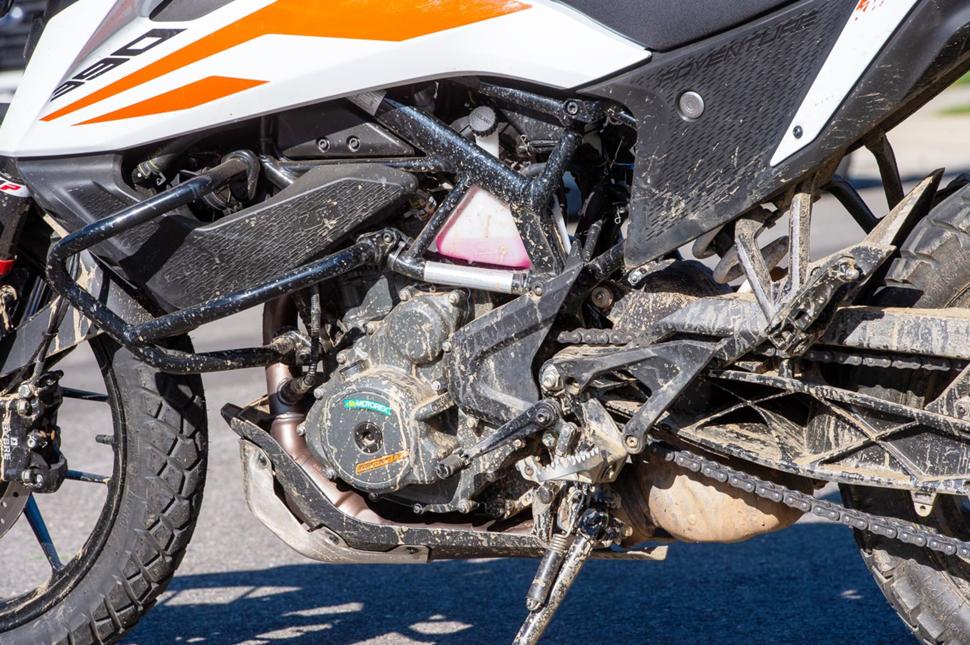 Когда кончится не только асфальт, но и грунтовка превратится в кашу - вы быстро вспомните, что кроссовер - это не эндуро. TKC 70, такие приятные на асфальте, едва справляются на грунте. От грязи и песка ничего хорошего ждать не приходится, а вот на гравии и влажном грунте шины вполне адекватны. Задняя держится неплохо, так что границы доступного зависят от передней шины. Широкое сиденье годится для езды по грунту, но не по грязи в стиле спортивного эндуро. В этом нет ничего плохого, но чтобы повторить KTM-овские промо-материалы на 390 Adventure, нужна немалая сила духа и неплохие навыки. Тут станет ощущаться вес - небольшой для туристического мотоцикла, но намного более существенный, чем у эндуро. Говорят, счастье - это знать свои пределы, и в случае с кроссоверами это чертовски верно. Зато наш мотоцикл KTM оснастили опциональной защитой двигателя, так что у меня на один повод для беспокойства было меньше.