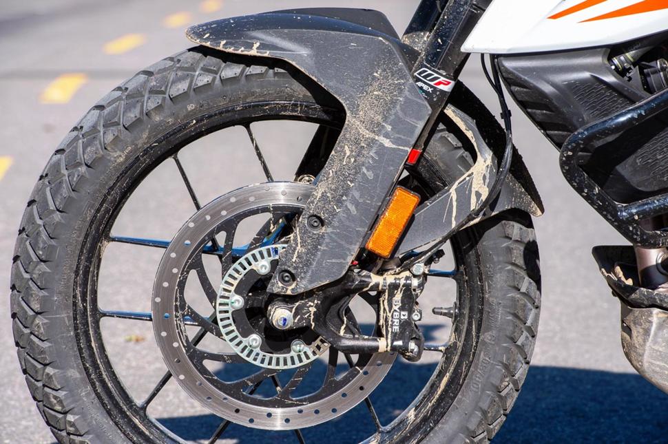 Тормозов KTM 390 Adventure хватает в любых ситуациях. Радиальный суппорт Bybre на 320-м диске прекрасно справляется на асфальте и при этом не перетормаживает на бездорожье. Двухканальная ABS Bosch 9.1MP отлично присматривает за тем, чтоб райдер не начудил. Я всё ждал, когда ABS начнёт меня злить во Внедорожном режиме, но переднее колесо ни разу не стрекотало - вероятно, я просто молодец и торможу аккуратно. На асфальте ABS и трекшн-контроль совершенно прозрачны, и я был рад иметь эти электронные ассистенты в дождь, даже несмотря на то, что я ни разу не ощущал их срабатывания. Задний тормоз работает отлично, и легко блокируется в режиме Внедорожной ABS. Причём легко - это в смысле тогда и только тогда, когда хочется дать юза: задний тормоз весьма информативен.