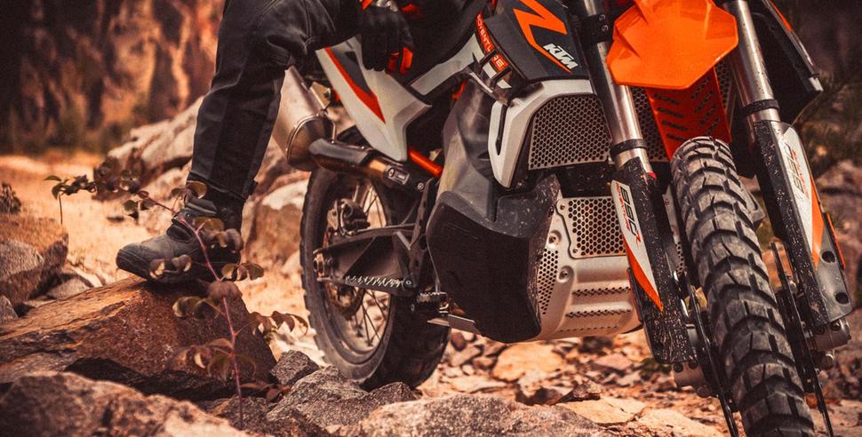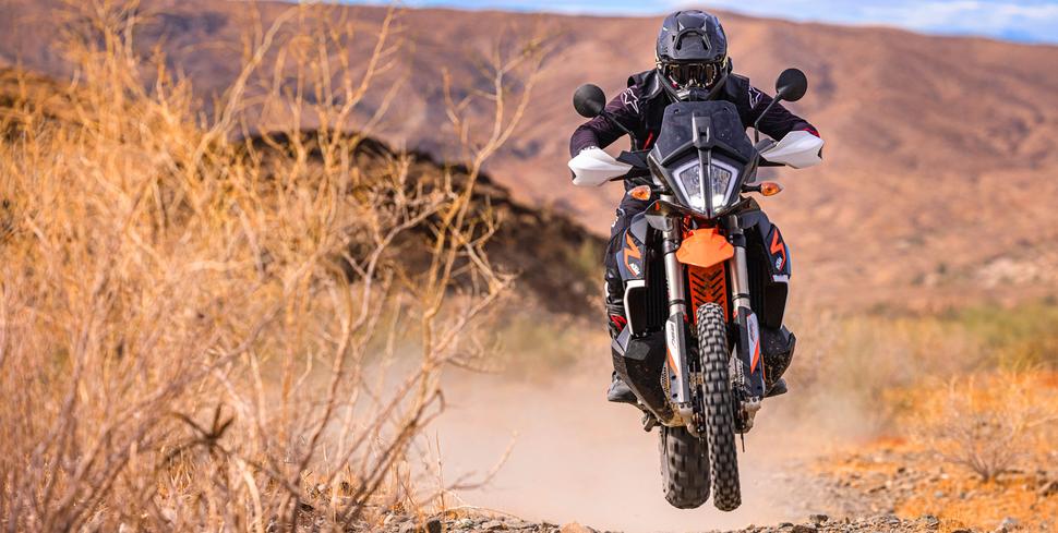 Впрочем, двигатель KTM 890 Adventure R на бездорожье приходится несколько урезонивать: в Дорожном режиме он более злой, чем хотелось бы для комфортной езды. С самых низов он даже несколько вялый, зато стоит чуть поддать газу - и он резко подрывает, показывая нрав. К счастью, электроника его полностью обуздывает, и во Внедорожном режиме он выдаёт удобную, управляемую тягу. К слову, 790-й имеет точно такой же характер с учётом чуть меньших цифр мощности: во Внедорожном прекрасен в качестве эндуро-мотоцикла, а в Дорожном рывок газом на любых оборотах и любых скоростях даёт мощное ускорение, определённо вызывающее привыкание.