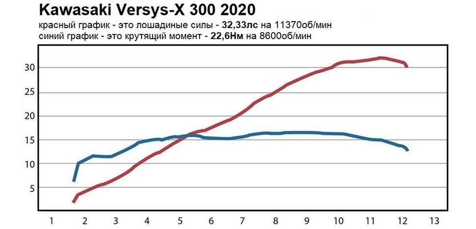 На диностенде Kawasaki Versys-X 300 2020 показал 32,33лс на 11370об/мин и 22,6Нм на 8600об/мин. Для 300 кубиков это весьма неплохие цифры, тем более принимая во внимание ровную полку момента и линейную характеристику мощности.
