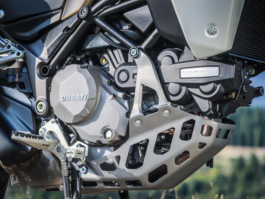 На первый взгляд, добавлять объёма и тяги на средних оборотах кажется странным способом сделать туристический мотоцикл более дружелюбным. Но фокус тут в том, что вместо раскручивания движка для получения тяги, DVT (система десмодромного регулирования фаз газораспределения) делает двигатель более тяговитым на любых оборотах. Благодаря этому можно меньше щёлкать вверх-вниз коробкой, и не только: мотоцикл теперь позволяет задирать колесо на высокой передаче и выезжать из мест с плохим сцеплением с дорожным покрытием. Но лучше всего новый двигатель Ducati Multistrada 1260 Enduro показывает себя на асфальте: благодаря изменяемому таймингу открытия-закрытия клапанов тяга присутствует на любых оборотах, поэтому можно пользоваться одной передачей на любых участках дороги. На третьей можно спокойно опустить обороты до 2000, а при открытии газа мотоцикл свободно разгонится с самых низов.