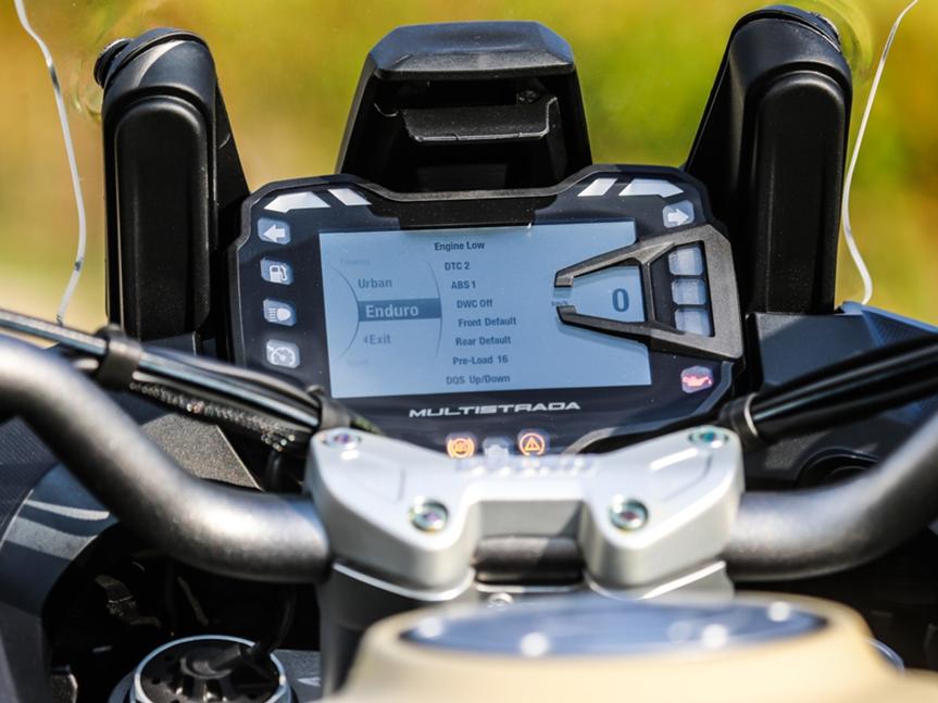 В установленном по умолчанию "городском" режиме у вас мотоцикл с гладким откликом на газ и мягкой подвеской - комфортный турер для беспроблемной езды по любой дороге. Быстрое переключение на режим Sport с помощью 5-дюймовой ЖК-панели - и всё сразу меняется: отклик Multistrada 1260 Enduro становится мгновенным, а ускорение резким на грани срыва колеса, с которым борется система трекшн-контроля DTC. Которая, кстати, прекрасно себя показывает на любой поверхности, включая кочки, пыль и заплатки.