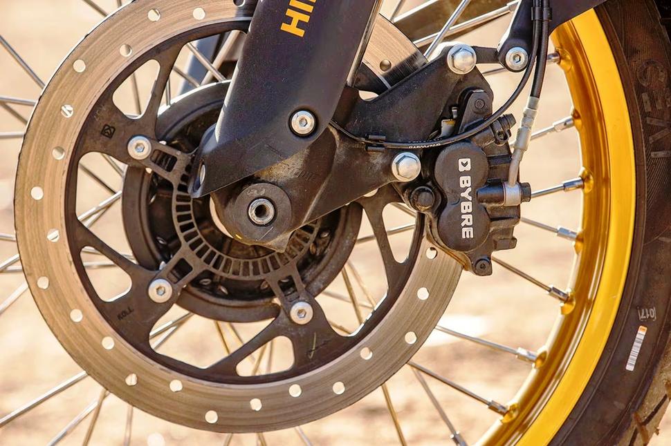 Тормозит Himalayan 450 двухпоршневым суппортом ByBre на 320-м диске спереди. К его преимуществам можно смело отнести хорошее тормозное усилие и отличную модуляцию, но мягкость отклика в начале хода требует некоторого привыкания. Для срабатывания передней ABS потребуется довольно сильный выжим рычага в условиях нормального зацепа. Однопоршневой суппорт сзади в этом смысле попроще: хороший выжим педали - и ABS уверенно срабатывает. Отключение задней ABS позволяет больше исследовать пределы зацепа с хорошей модуляцией и контролем.
