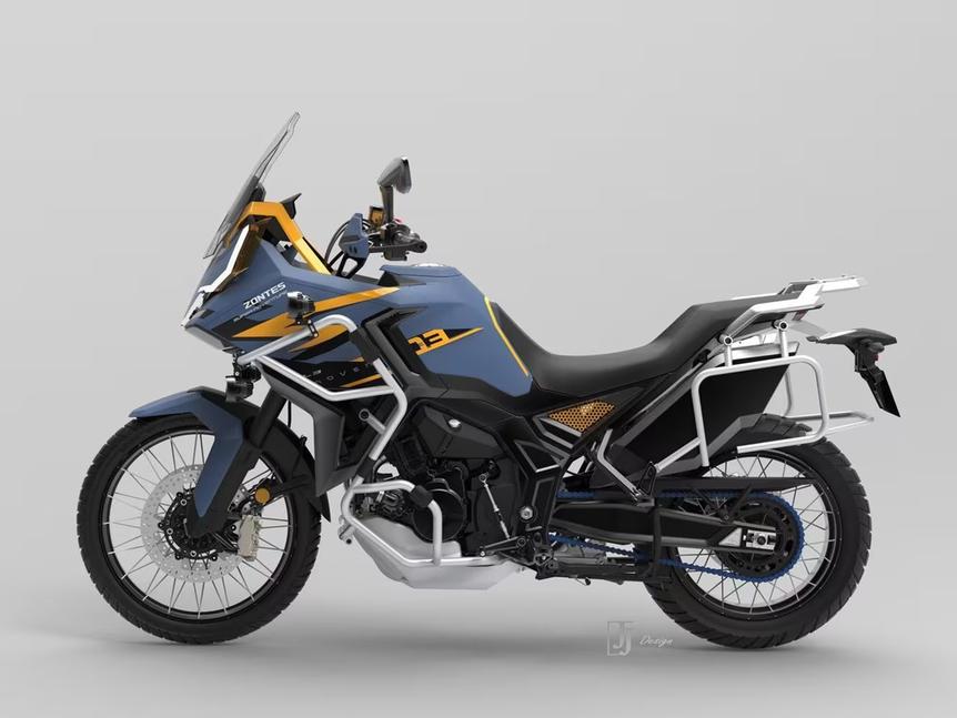 Дизайнеры Zontes решили обойтись без клишированного "клюва", присущего многим современным турэндуро, и выбрали крутой высокий ветровик над резко скошенным носом. Также дизайнеры решили отказаться от изгибов в пользу прямых линий, пересекаемых резкими складками, и общий вид получился достаточно строгий и лаконичный, без явных отсылок к раллийным или кроссовым мотоциклам, но со вполне узнаваемым предназначением. Мотоцикл штатно оборудован дугами безопасности, багажными рамками и довольно внушительным защитным поддоном, а спицованные колёса, судя по всему, могут быть обуты в бескамерную резину.